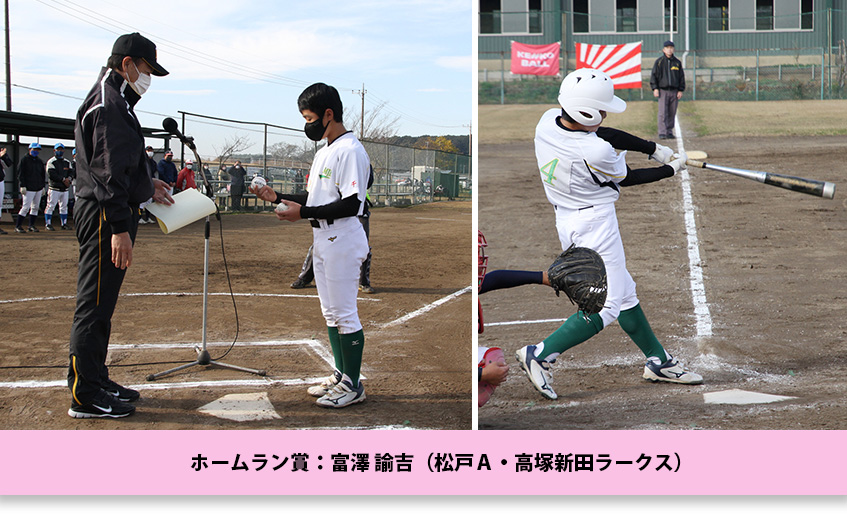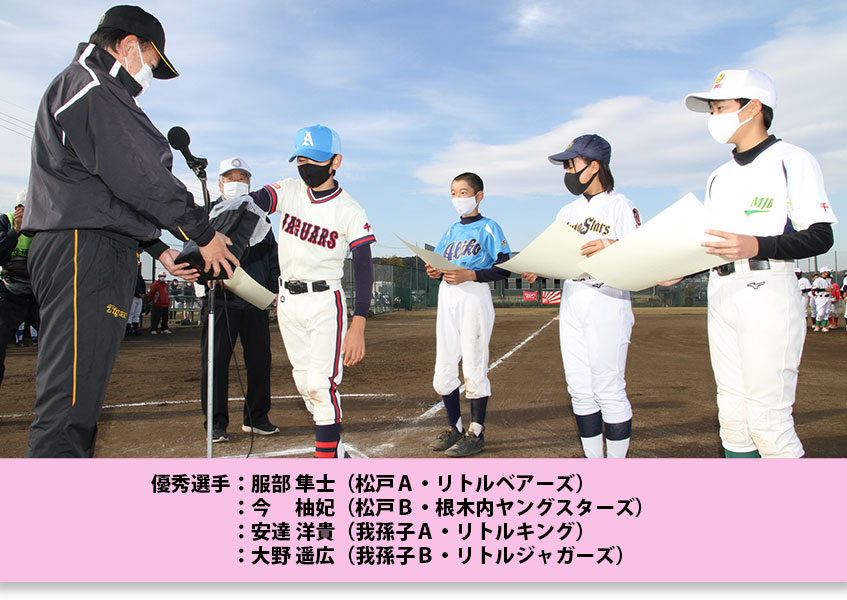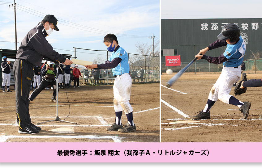 この試合は、新型コロナウイルス蔓延による緊急事態宣言等の影響で開催できなかった本大会に代わり、両市6年生の選抜チームによるエキシビションマッチで、試合後には優秀選手が選出され、阪神タイガース和田TAから記念の賞品が手渡されました。