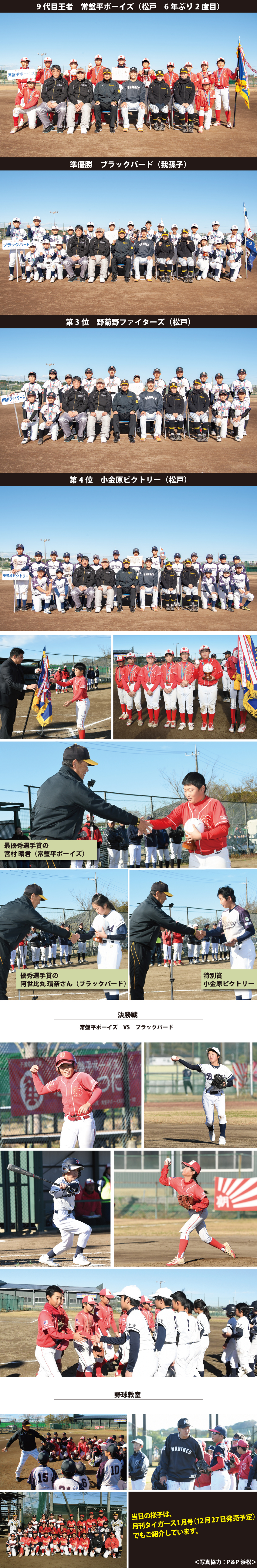 今回で9回目となる「和田豊旗争奪少年野球大会」が開催され、12月8日に我孫子市少年野球場で決勝と3位決定戦、表彰式が行われました。この大会は阪神タイガース和田コーディネーターに縁の深い松戸市の少年軟式野球連盟と我孫子市少年野球が中心となって開催されている大会で、今大会は松戸市の常盤平ボーイズが6年ぶり2度目となる優勝を果たしました。